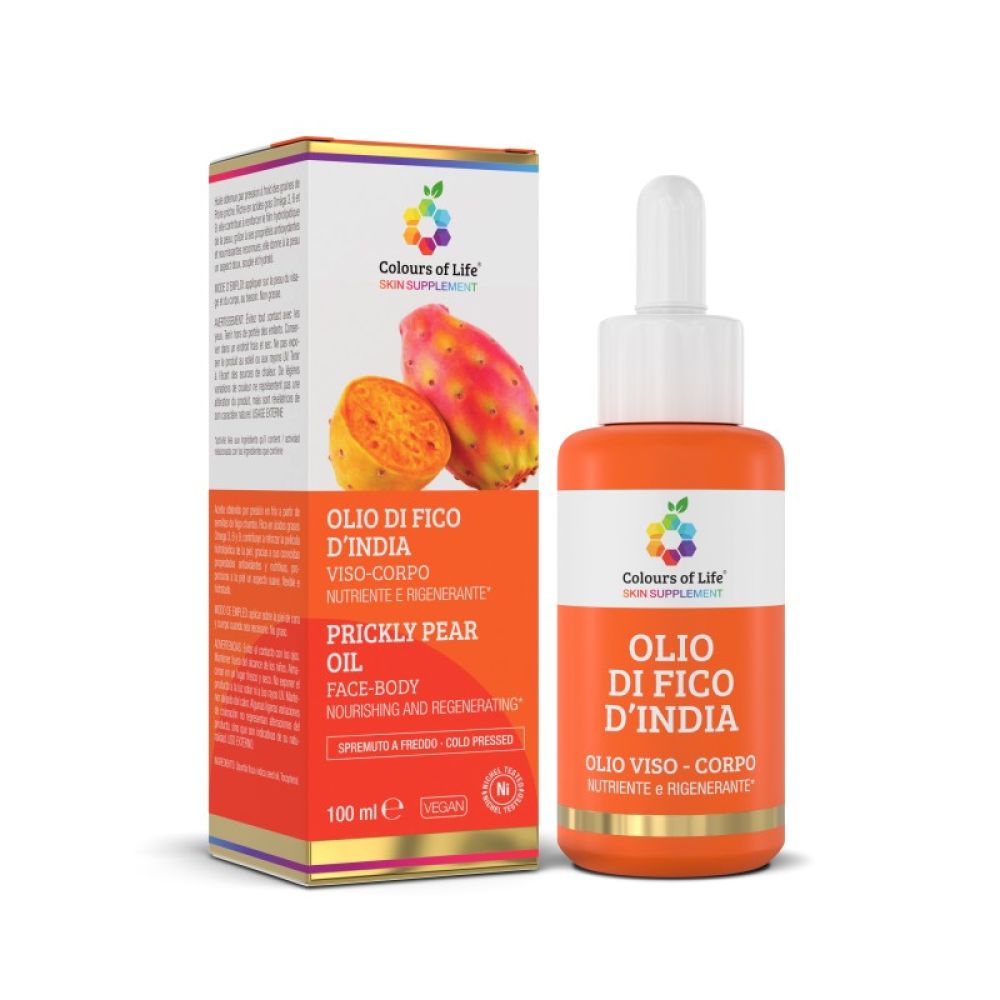 L’olio di FICO D’INDIA di Colours of Life® è ottenuto per spremitura a freddo dai semi della pianta Opuntia ficus indica L., in modo da mantenere inalterati tutti i componenti bioattivi in esso contenuti e di conseguenza le sue proprietà benefiche. La pianta di Fico d’India è diffusa in tutto il mondo; se ne consumano principalmente i frutti, ma anche i cladodi vengono impiegati nella preparazione di integratori, tisane e prodotti cosmetici. Infine dai semi viene estratto un olio ricco in acidi grassi insaturi, in particolare acido linoleico e oleico, e in Vitamina E, potente antiossidante. É ritenuto tra i rimedi naturali più efficaci nel combattere i radicali liberi e nel proteggere pelle e capelli dai segni del tempo. L’olio di fico d’India è leggero e si assorbe facilmente. Ha un’azione cicatrizzante, seboregolatrice e antinfiammatoria, per cui viene usato particolarmente per contrastare l’acne e altre infiammazioni della pelle. Data l’ottima azione antiossidante è ideale come ingrediente per tutti i prodotti anti-age; grazie alla presenza di tocoferoli, preserva la pelle dai danni causati da smog, raggi UV e temperature rigide. MODO D'USO: Applicare sulla pelle di viso e corpo secondo necessità. Non unge. INDICAZIONI D'USO Idratante e NutrienteIdratante e Nutriente Pelle normale-seccaPelle normale-secca Protezione e IdratazioneProtezione e Idratazione