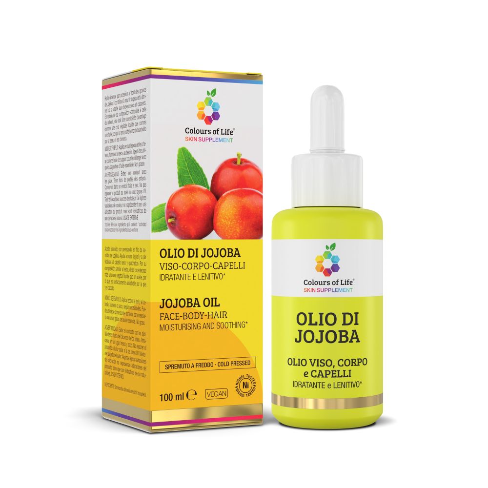 L’olio di JOJOBA di Colours of Life® è ottenuto per spremitura a freddo dai semi della pianta Simmondsia chinensis, in modo da mantenere inalterati tutti i componenti bioattivi in esso contenuti e di conseguenza le sue proprietà benefiche. L‘olio di Jojoba è ampiamente utilizzato in prodotti destinati alla skin care che ne sfruttano le sue caratteristiche sebosimili. Viene spesso definito “olio” per la sua natura liquida, trasparente e di colore giallo pallido. In realtà è l’unica specie vegetale attualmente nota che sintetizza una “cera liquida”: non si tratta infatti di una miscela di trigliceridi, tipica degli oli vegetali, ma piuttosto di singoli acidi grassi insaturi, soprattutto acido oleico (30-45%), e alcoli. Questa composizione rende l’olio di Jojoba estremamene leggero, molto più simile al sebo umano piuttosto che ad un olio, e per questo viene assorbito perfettamente a livello cutaneo. È ricchissimo di Vitamina E, un composto con azione fortemente antiossidante che protegge le cellule della pelle dall’ossidazione e quindi dall’infiammazione. Viene utilizzato in caso di secchezza della pelle, ma anche in condizioni di infiammazione, come dermatite atopica, e in caso di pelli sensibili, anche sulla pelle dei bambini. È in grado di velocizzare il processo di guarigione e di svolgere una blanda azione antisettica, risultando utile anche in formulazioni per il trattamento di acne, psoriasi e irritazioni cutanee in generale. MODO D'USO: Applicare sulla pelle e sui capelli, umidi o asciutti, secondo necessità. Può essere utilizzato come olio vettore per miscelarlo con qualche goccia di olio essenziale. Non unge. INDICAZIONI D'USO: Cute e capelli danneggiatiCute e capelli danneggiati Idratante e NutrienteIdratante e Nutriente Pelle normale-seccaPelle normale-secca Protezione e IdratazioneProtezione e Idratazione