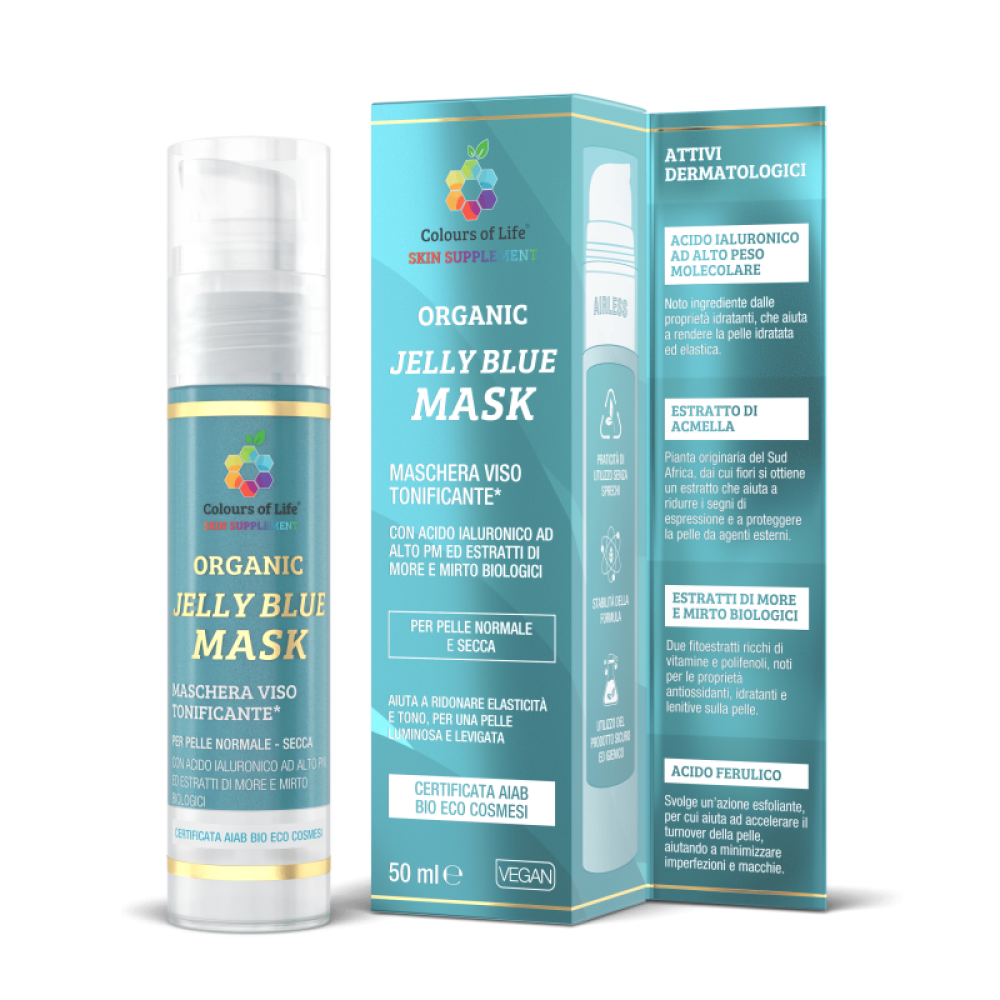 Maschera viso in gel ideata con attivi dalle qualità anti-age ed illuminanti. Certificata AIAB Bio Eco Cosmesi. La colorazione della maschera è data dall’estratto di semi di Gardenia dai quali viene ricavato un pigmento di colore blu intenso, che